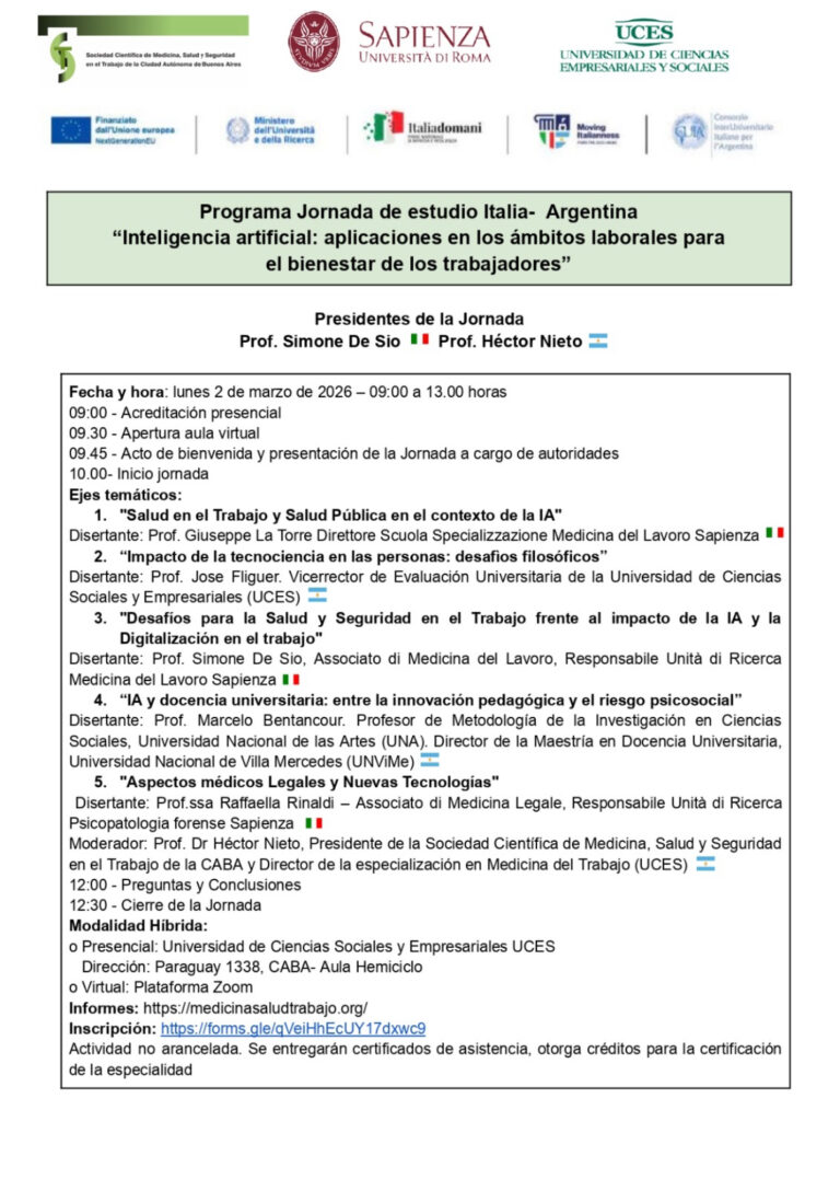 I Conferencia organizada por la Academia Internacional de Medicina del Trabajo, Medicina Legal y Salud Pública en colaboración con la Sociedad Científica de Medicina, Salud y Seguridad en el Trabajo de la Ciudad Autónoma de Buenos Aires, la UCES, la embajada de Italia en Buenos Aires y la Universidad Sapienza de Roma, Italia.
